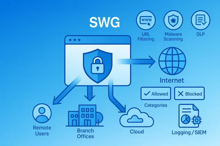 A Secure Web Gateway (SWG) acts as a barrier between users and the internet, ensuring that only safe and legitimate content is allowed. It filters web traffic to prevent access to harmful websites and blocks malicious content such as viruses or malware. SWGs can also enforce corporate policies, ensuring that users only access approved websites, while logging and reporting all web activity for monitoring and compliance purposes.